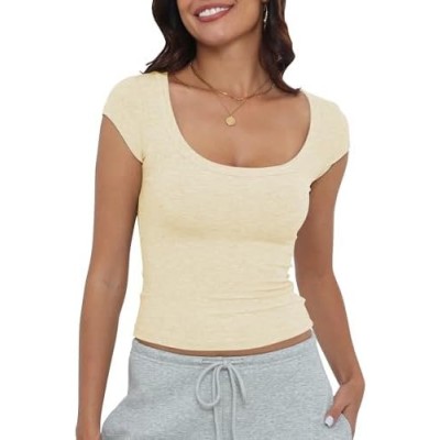 Artfish Women's Short Sleeve T-Shirts Low Scoop Neck Slim Fitted Ribbed Knit Casual Longer Crop Top
