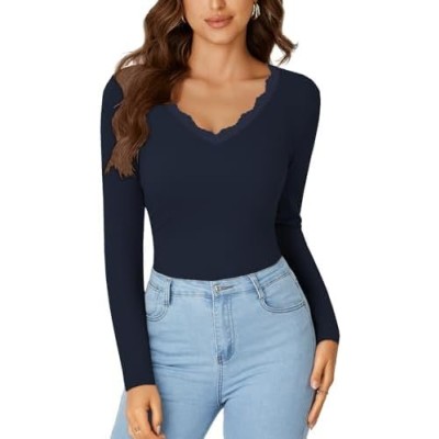 LYANER Women's Long Sleeve Shirts Lace V Neck Basic Casual Ribbed Knit Tops Cute Fashion Clothing